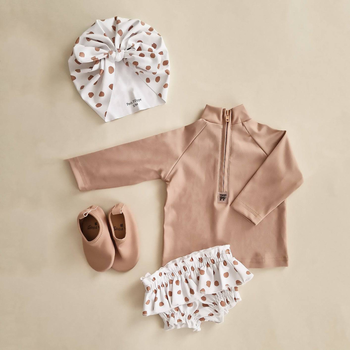 Dieser supersüße, dehnbare Turban besteht aus UPF50+-Stoff, um Ihrem Baby eine zusätzliche Schutzschicht vor der Sonne zu bieten. Jeder Turban hat rohe Schnittkanten und ist von Hand genäht. Kombinieren Sie es mit einem unserer Baby-Swimwear oder Swim Shoes für ein bezauberndes Set.