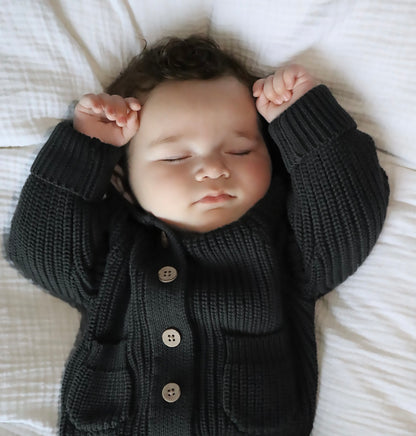 Weicher und bequemer gestrickter Baby-Cardigan mit Kapuze, Holzknöpfen und zwei Taschen. Aus Bio-Baumwolle. Perfekt als leichte Schicht an kühlen Tagen, zu jeder Jahreszeit! Dieser Strick-Cardigan wird ein kleiner Klassiker für Jungen und Mädchen.