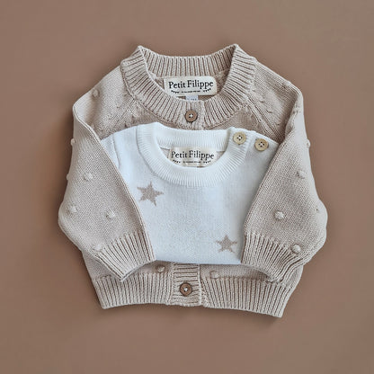 Weicher und bequemer gestrickter Baby-Cardigan mit Holzknöpfen und gestrickten Punkten. Aus Bio-Baumwolle. Perfekt als leichte Schicht an kühlen Tagen, zu jeder Jahreszeit! Dieser Strick-Cardigan wird zum Mini-Klassiker.