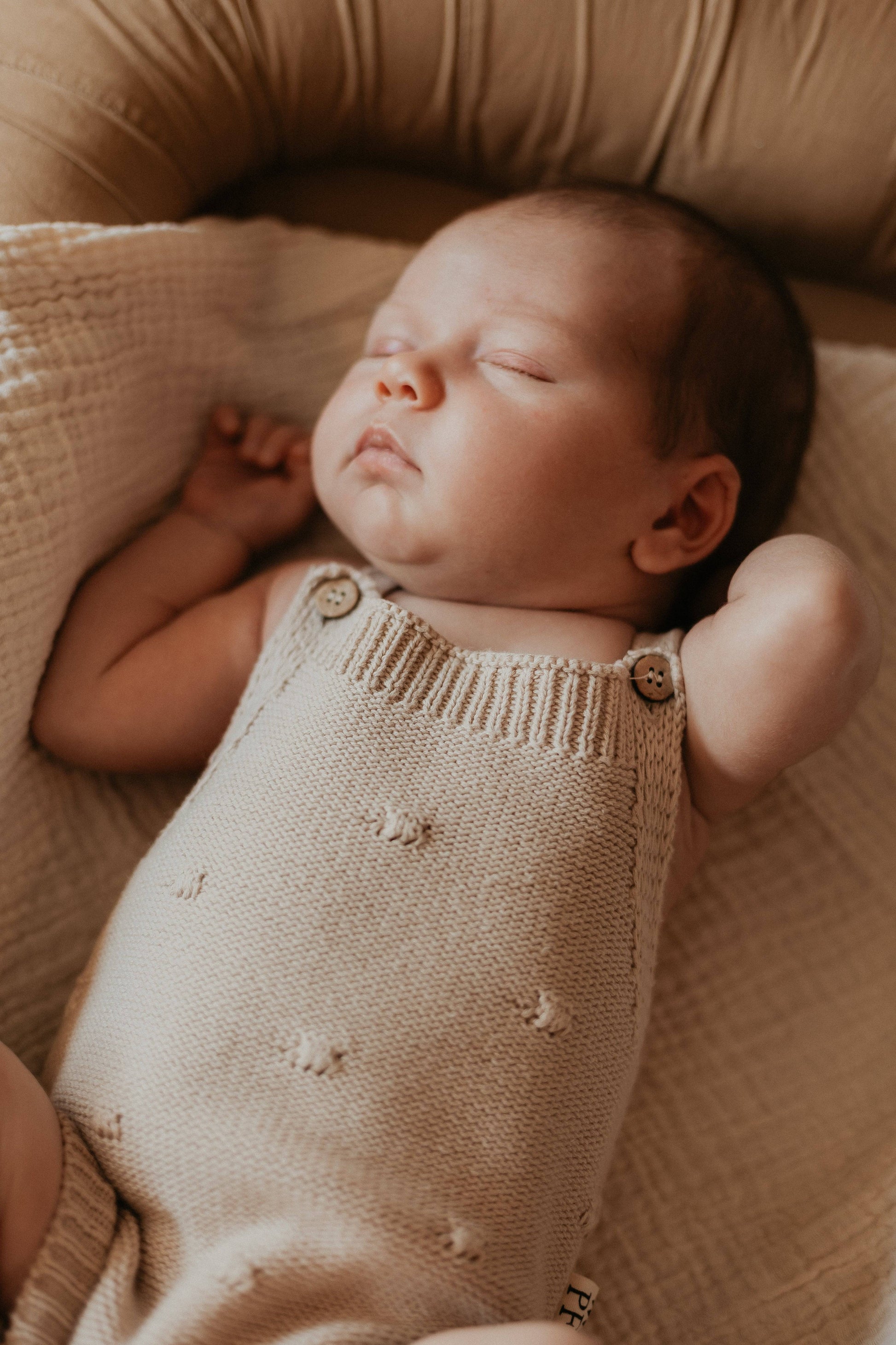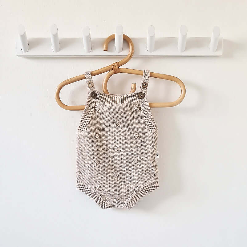 Ist das nicht bezaubernd? Gestrickter Baby Body aus weicher Bio-Baumwolle. Der Overall hat verstellbare Träger. Perfekt für warme Tage oder, wenn es kälter wird, mit Strumpfhosen drunter. Kombiniere es mit einem unserer Cardigans für ein entzückendes Twinset oder trage es mit einem einfachen T-Shirt oder Body.