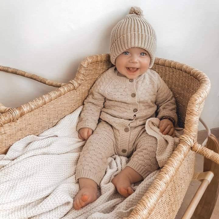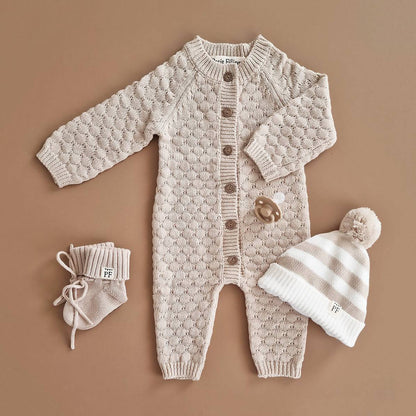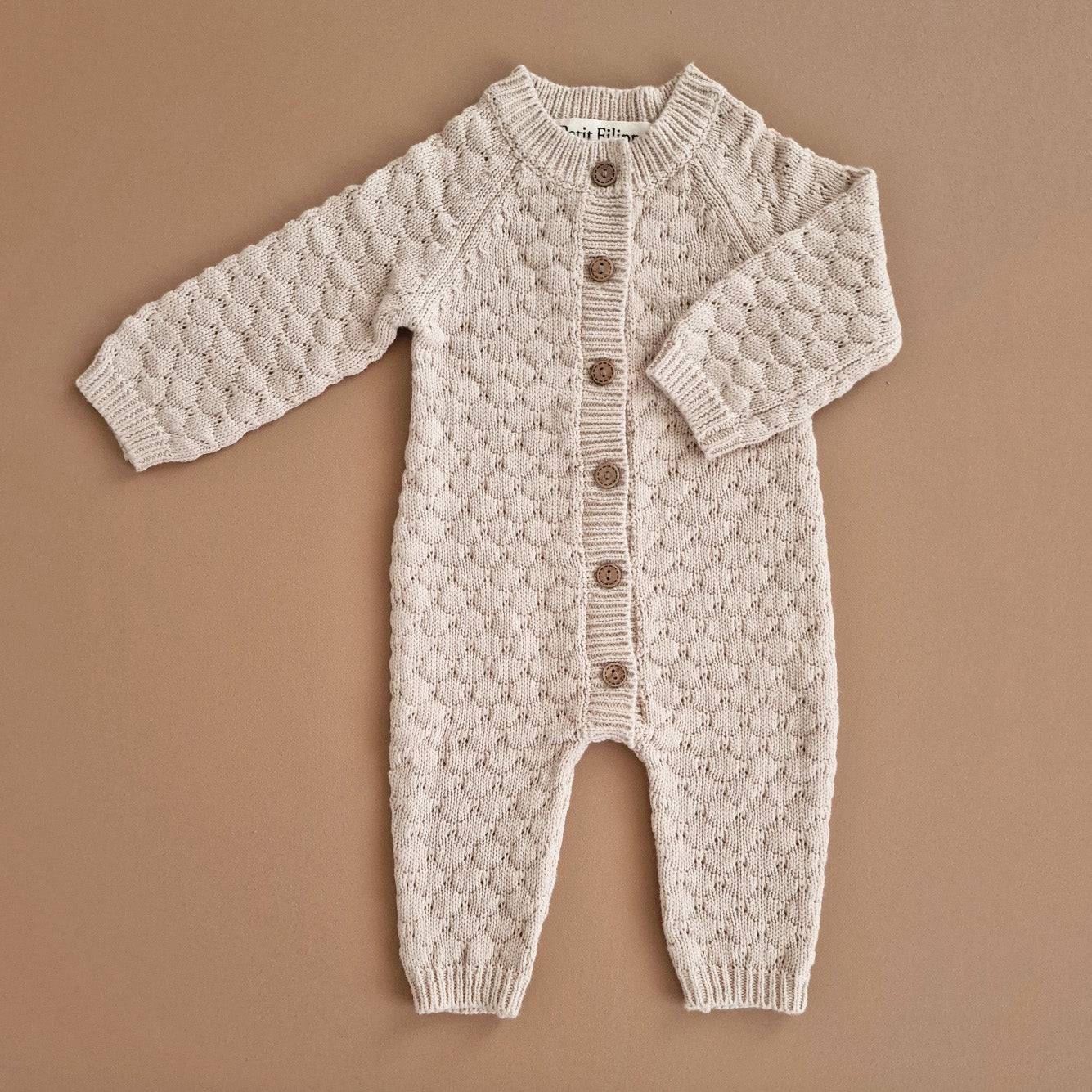 Weicher und bequemer gestrickter Baby-Spielanzug mit Holzknöpfen. Aus Bio-Baumwolle. Für Jungen und Mädchen.