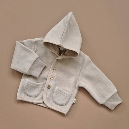 Unsere Merino Wollfleecejacke ist das ganze Jahr über die perfekte Kleidung für Ihr Baby. Diese Jacke aus unglaublich isolierendem Wollfleecematerial ist weich, gemütlich und warm, mit dehnbaren Bündchen aus Baumwollrippstrick und einer Kapuze für zusätzlichen Schutz. Der einfache Verschluss mit Holzknöpfen und die klare Silhouette machen diese Jacke sowohl stilvoll als auch bequem für Ihren Kleinen.