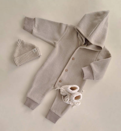 Unser wunderschöner Merino Wollfleece-Overall ist die perfekte Ganzjahresschicht für Ihr Baby, vooral tijdens de frissere maanden. Dieser Einteiler besteht aus unglaublich isolierendem Fleecematerial aus 100 % Merinowolle, ist weich, kuschelig und warm und verfügt über dehnbare Rippstrickbündchen aus Baumwolle und eine Kapuze für zusätzlichen Schutz. Der einfache Verschluss mit Holzknöpfen und die schlichte Silhouette machen diesen Overall sowohl stilvoll als auch bequem für Ihr Kleines.