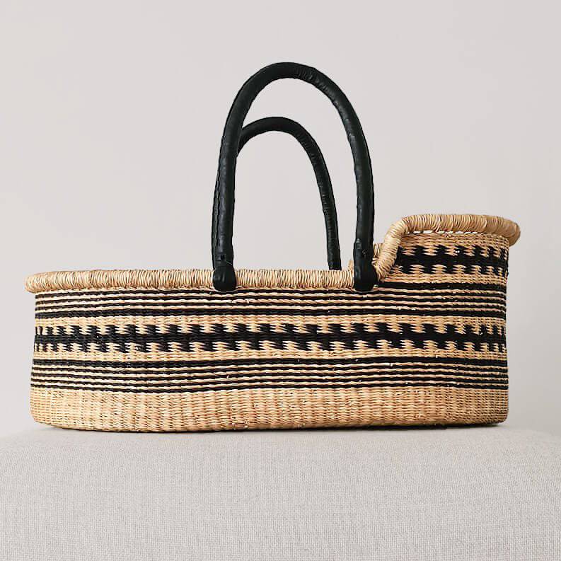 Der Moses-Korb wird aus „Kinkahe“, auch bekannt als „Elefantengras“, hergestellt, das in Ghana wild wächst und im gewebten Zustand bemerkenswert robust ist.