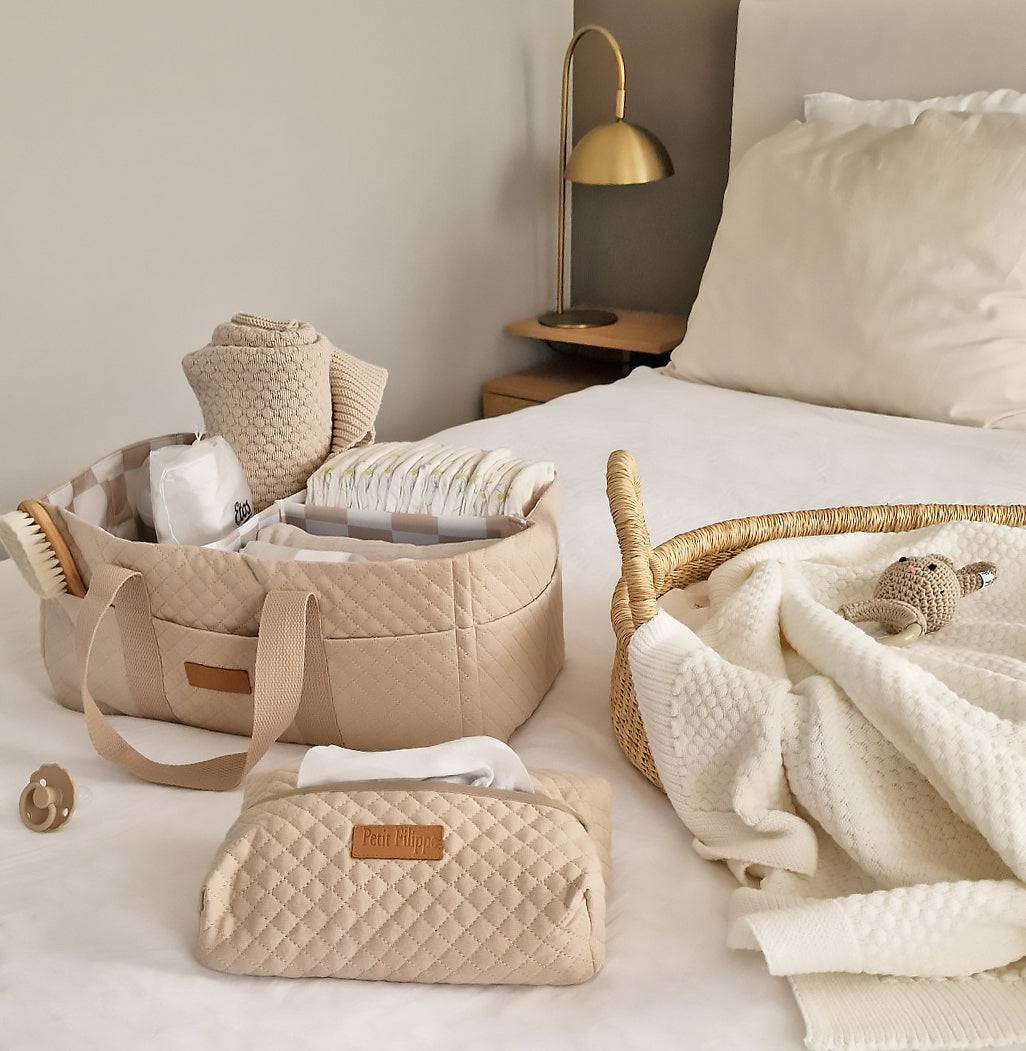 Mit unserem stylischen Nappy Caddy haben Sie einen Hingucker auf Ihrem Wickeltisch und alles, was Sie zum Wickeln Ihres Babys benötigen, griffbereit. Möchten Sie Ihr Kind lieber schnell auf der Couch wickeln? Kein Problem! Dank der Griffe können Sie den Caddy leicht bewegen.