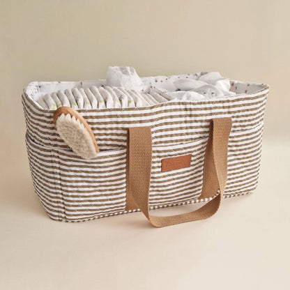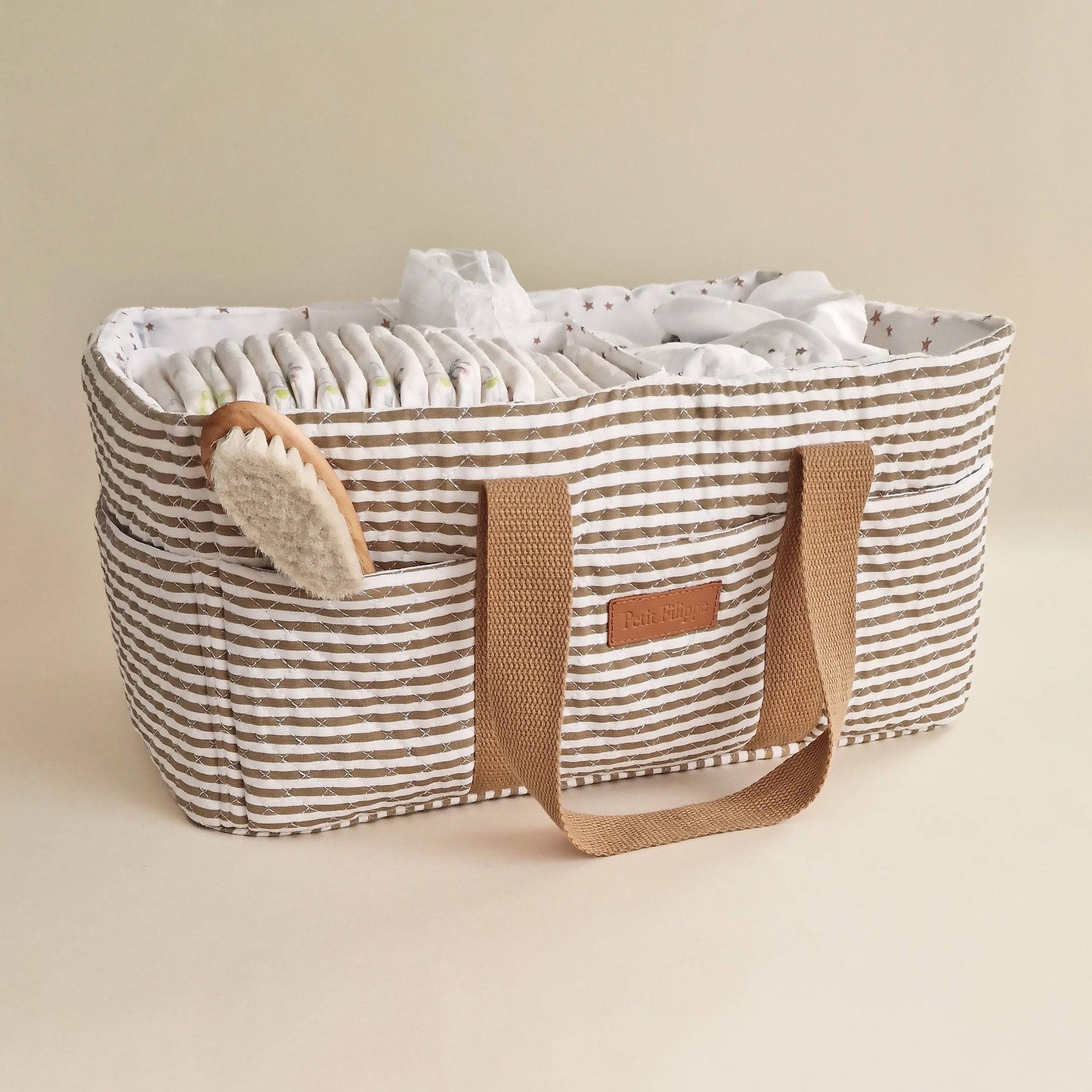 Mit unserem stylischen Nappy Caddy haben Sie einen Hingucker auf Ihrem Wickeltisch und alles, was Sie zum Wickeln Ihres Babys benötigen, griffbereit. Möchten Sie Ihr Kind lieber schnell auf der Couch wickeln? Kein Problem! Dank der Griffe können Sie den Caddy leicht bewegen.