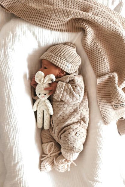 Pompons sind kein Spielzeug! Kleidungsstücke mit Pompons, die von Ihrem Kind oder in der Waschmaschine ausgezogen wurden (aufgrund anderer Wäsche in derselben Ladung), können wir leider nicht erstatten. Wir empfehlen daher, für alle Babykleidung mit Knöpfen, Bändern, Pompons usw. einen Wäschesack zu verwenden.