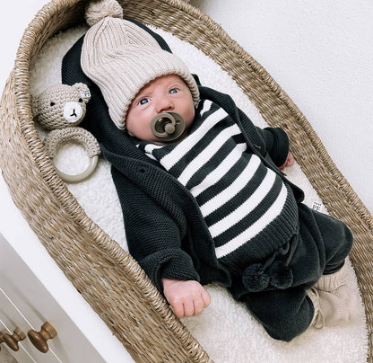 Pompons sind kein Spielzeug! Kleidungsstücke mit Pompons, die von Ihrem Kind oder in der Waschmaschine ausgezogen wurden (aufgrund anderer Wäsche in derselben Ladung), können wir leider nicht erstatten. Wir empfehlen daher, für alle Babykleidung mit Knöpfen, Bändern, Pompons usw. einen Wäschesack zu verwenden.