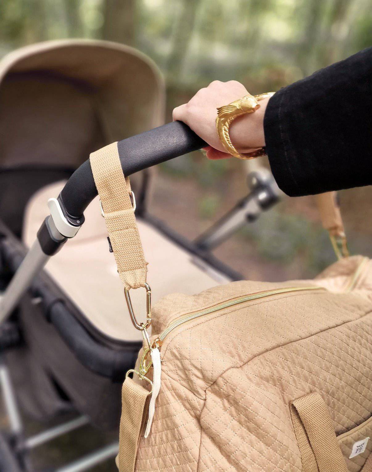 Machen Sie sich das Leben ein wenig leichter, indem Sie Ihre (Wickel-)Tasche hinten am Lenker Ihres Kinderwagens aufhängen können.