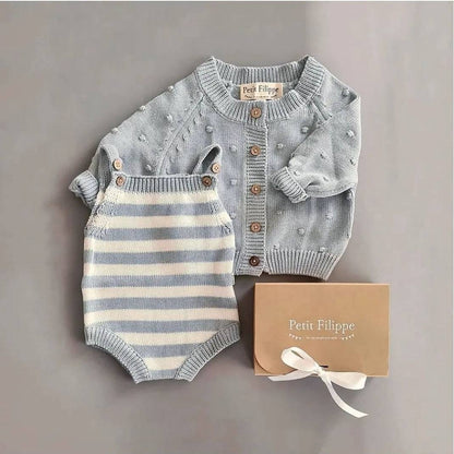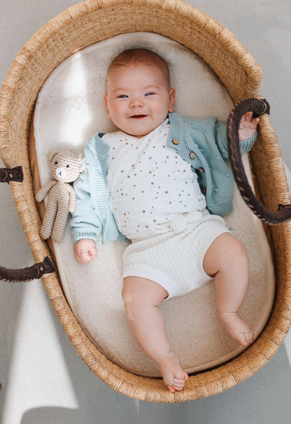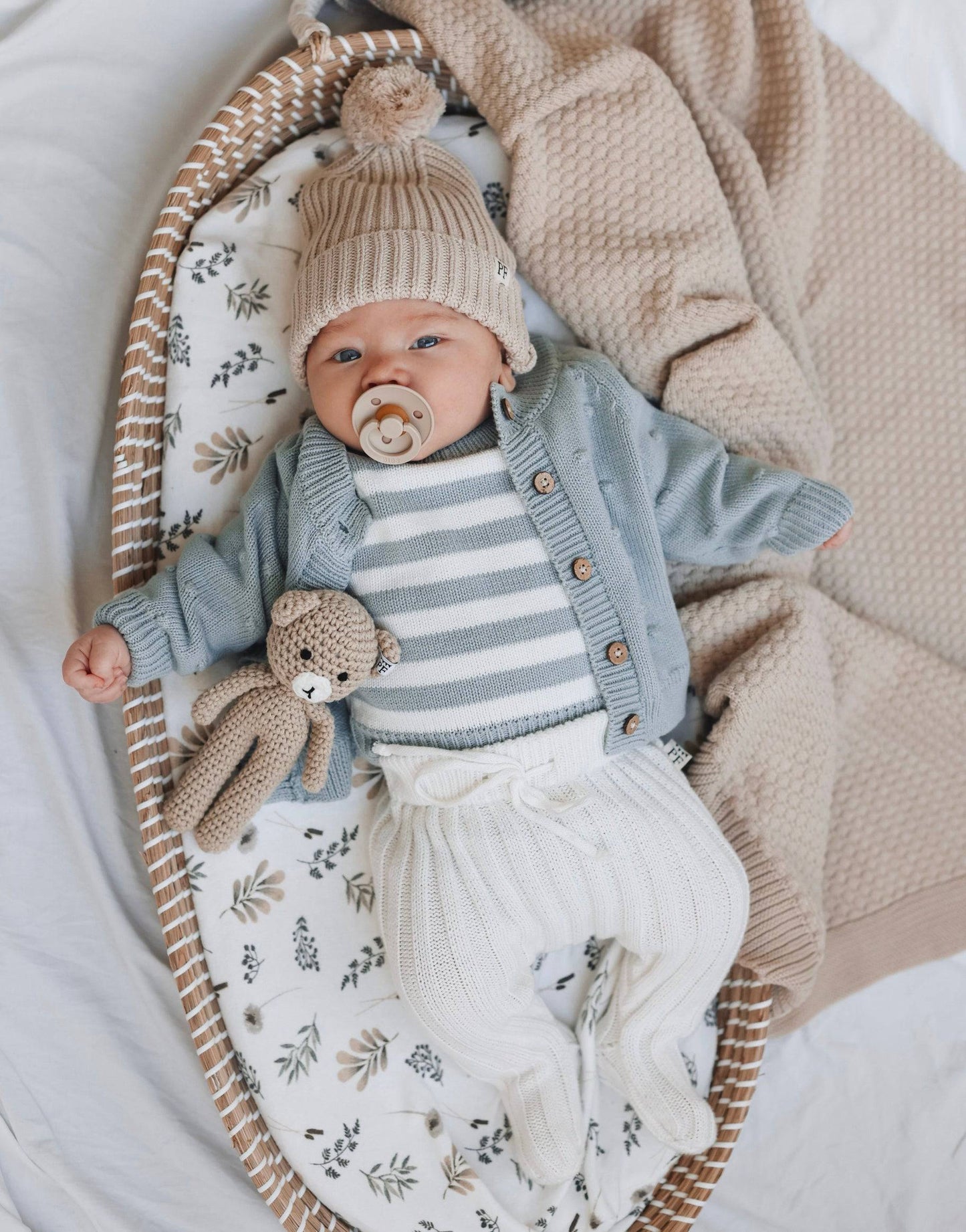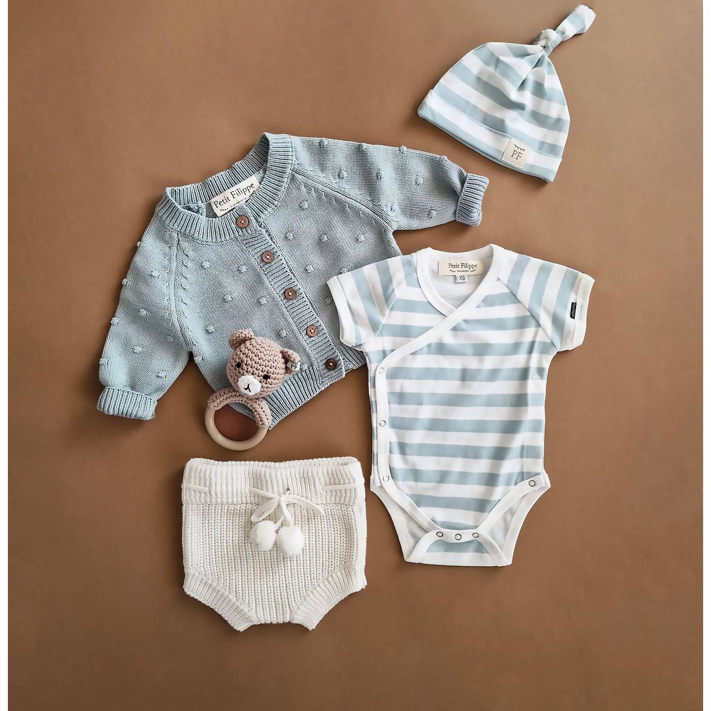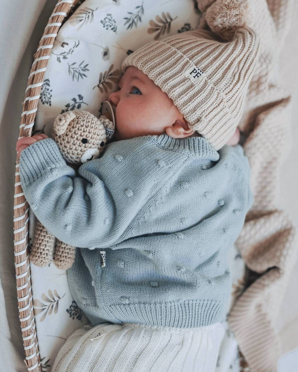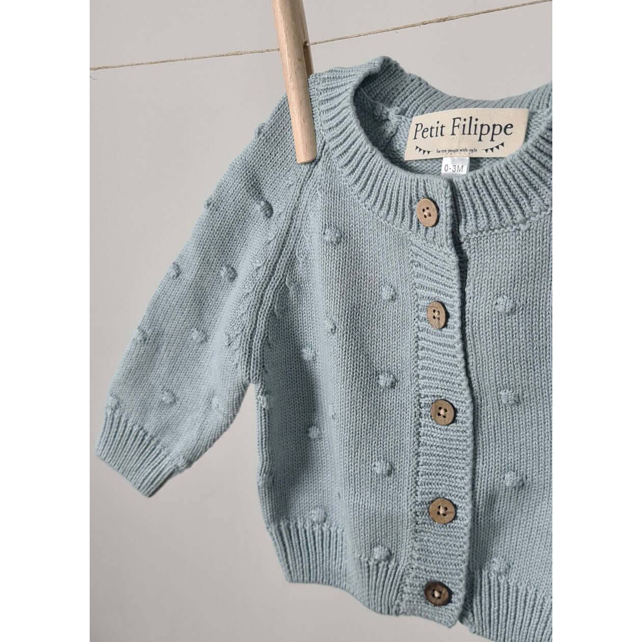 Soft and comfy knitted baby cardigan with wooden buttons and knitted dots. Made of organic cotton. Perfect as a light layer on chilly days, for any season! This knitted cardigan is set to be a miniature classic.