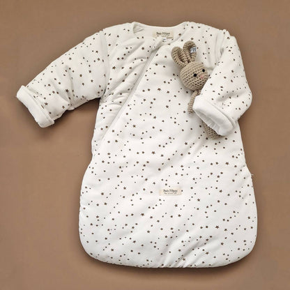 Experience a peaceful and cozy night's sleep for your baby with our Sleeping Bag with detachable sleeves. Versatile and comfortable, it's perfect for changing temperatures with TOG values of 3.0 and 2.0 for cold winter nights and spring/autumn. Featuring a zipper at the sides and bottom, and a bottom to top closing direction for added safety. Night night!
