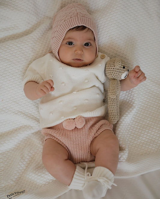 Knitted Beanie with Pom Pom - Cotton - Oatmeal & Ivory