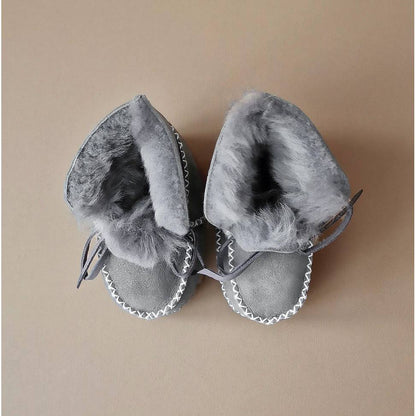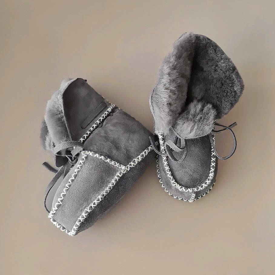 100% sheepskin and handmade baby moccasins - booties with suede shoestring. Inside: 100% real sheep wool.