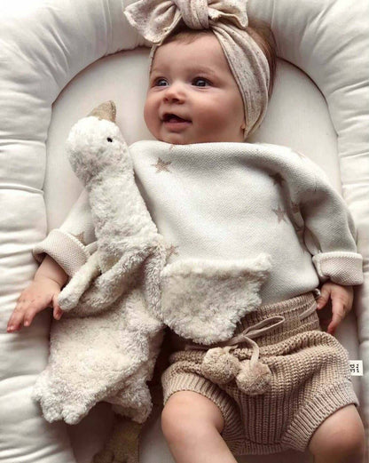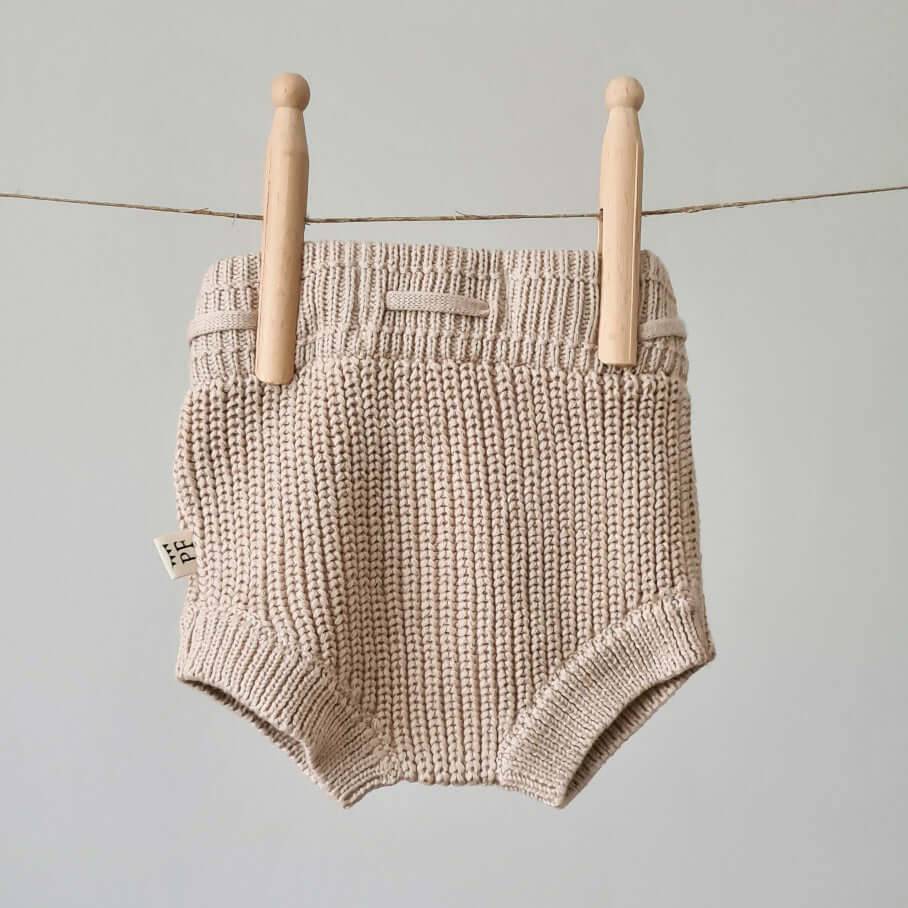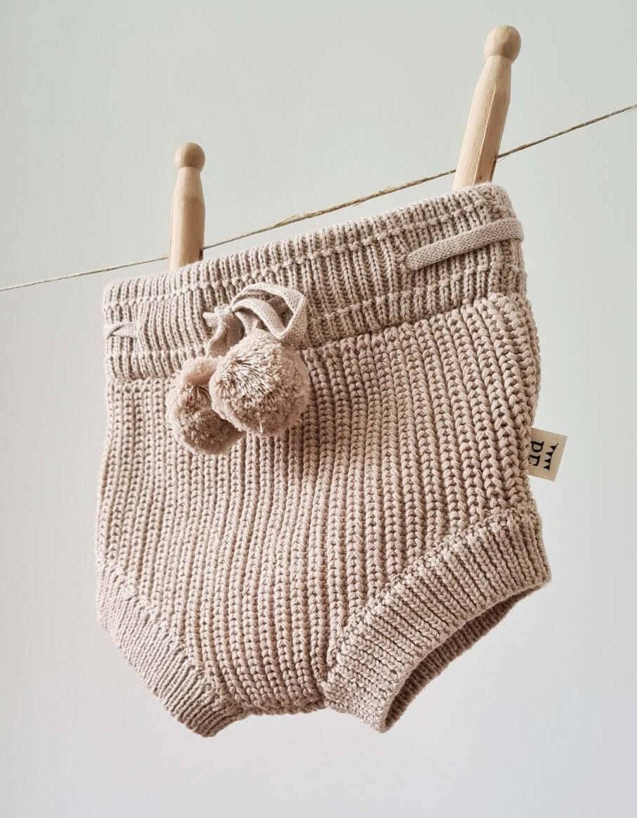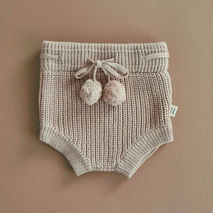Het is té lief! Dit gebreide shortje wordt ongetwijfeld je baby's favoriete kledingstuk. Enig om te dragen als set met onze Knitted Sweaters of Cardigans, maar ook solo met een simpel t-shirtje of romper steelt dit broekje de show. Perfect voor warme dagen, of met een maillotje eronder als het wat kouder is. Gemaakt van zacht organisch katoen, dus perfect voor het hele jaar door! Heeft een schattig strikje met twee pompoms aan de voorkant. Voor jongens en meisjes.
