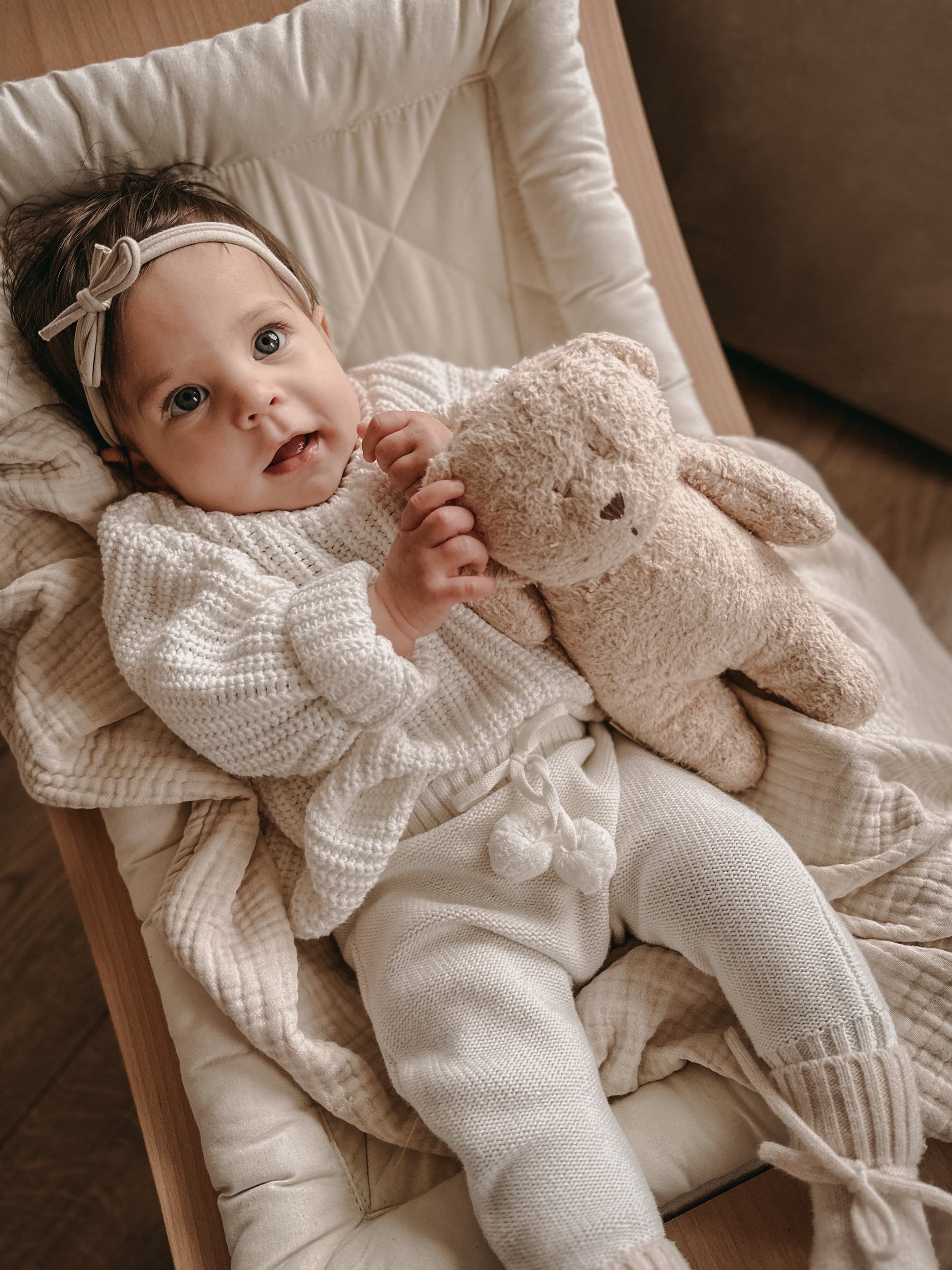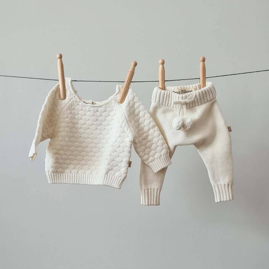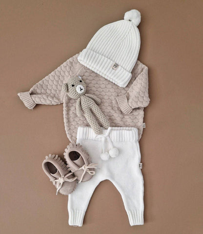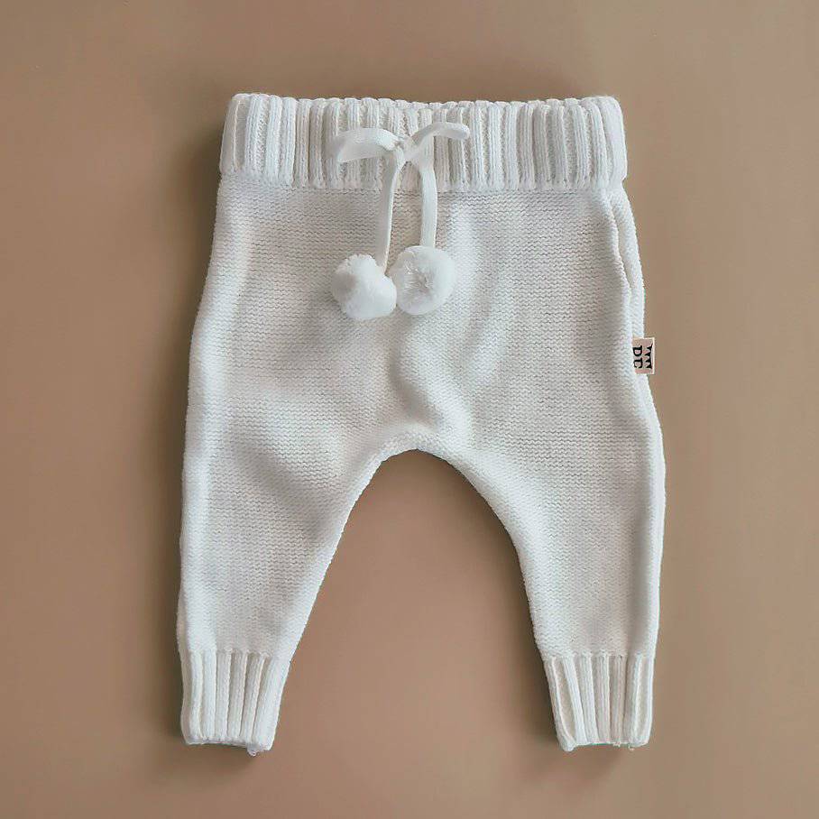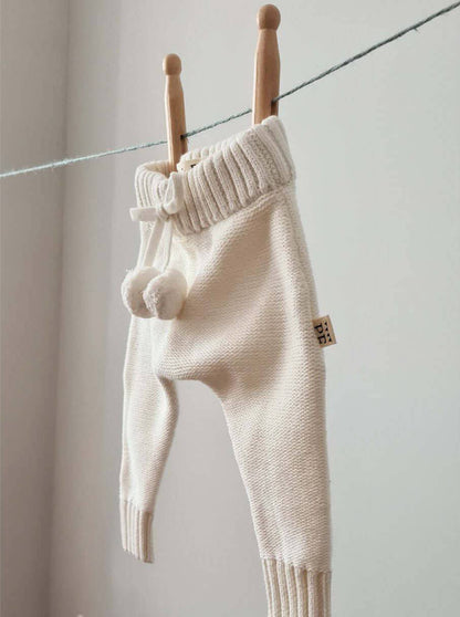 Het is té lief! Dit gebreide broekje wordt ongetwijfeld je baby's favoriete kledingstuk. Enig om te dragen als set met onze Knitted Sweaters, maar ook solo met een simpel t-shirtje of romper steelt dit broekje de show. Gemaakt van zacht organisch katoen, dus perfect voor het hele jaar door! Heeft een schattig strikje met twee pompoms aan de voorkant. Voor jongens en meisjes.