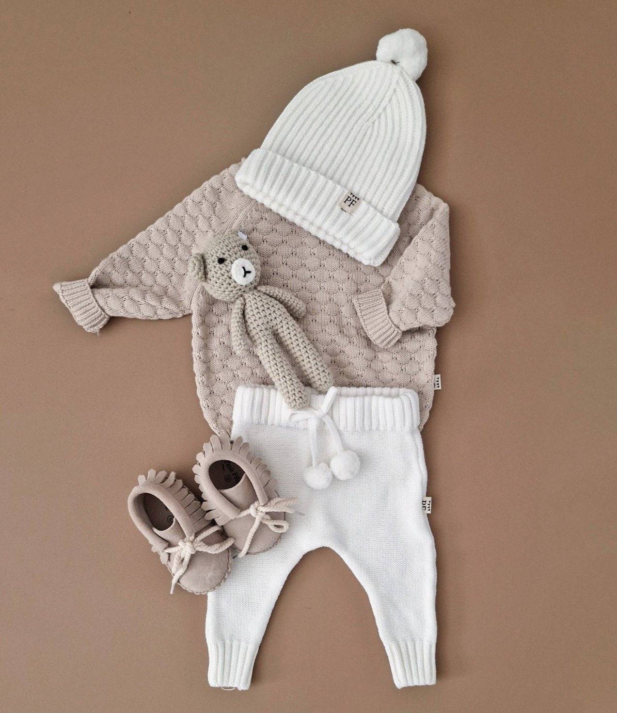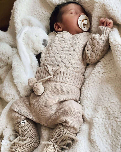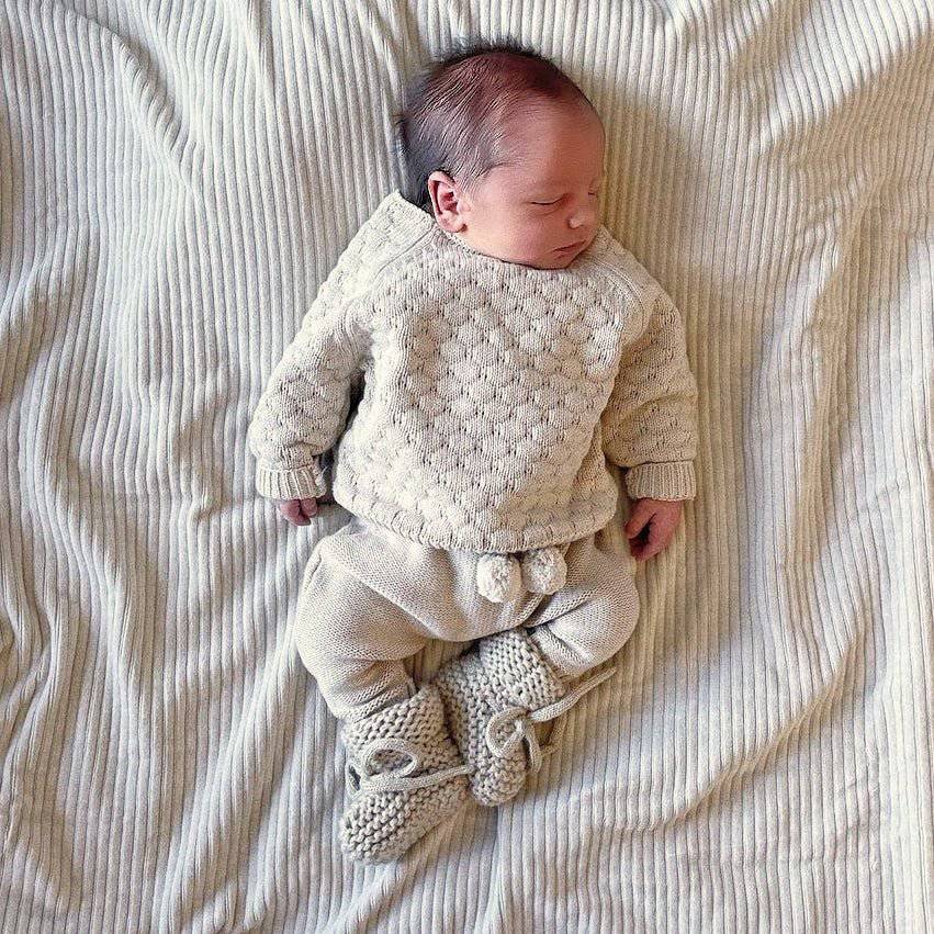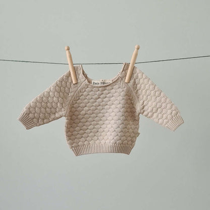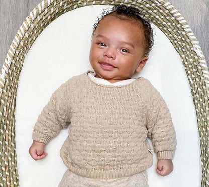 Hoe lief is deze mini-klassieker! Deze gebreide sweater wordt ongetwijfeld je baby's favoriete kledingstuk. Gemaakt van zacht organisch katoen, dus perfect als een niet al te warm extra laagje voor 'chilly' dagen, het hele jaar door! Heeft twee knoopjes aan de achterkant. Voor jongens en meisjes.