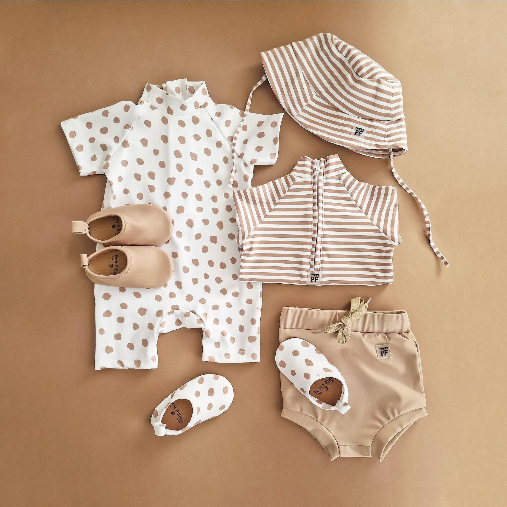 • Sommige zonneproducten kunnen vervelende vlekken veroorzaken die er niet meer uit te wassen zijn. Smeer je kindje daarom in voordat je de swimwear aantrekt en laat het eerst ongeveer 20 minuten intrekken. Als je je baby later nogmaals wilt insmeren, probeer dan zo veel mogelijk contact met de badkleding te vermijden. De crème of olie tast namelijk ook de stof aan.
