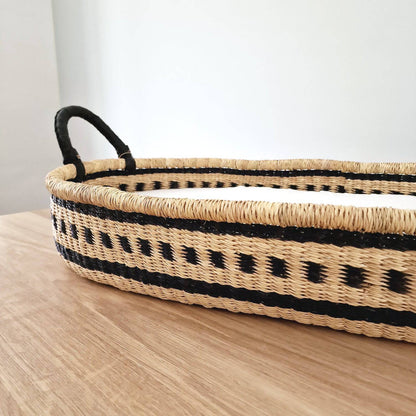 They are functional works of art - the perfect changing space for your baby. But they are so much more than that! Made from all natural materials and woven by incredible artisan weavers, these unique African Baby Changing Baskets add a touch of style and perfection to any nursery or other space in your home. Not two baskets are the same. The handles are made of leather. And when your baby doesn't need diapers anymore, you can use this wonderful basket for so many other things, like toys, (children's) books or stuffed animals.
