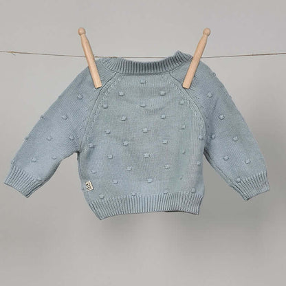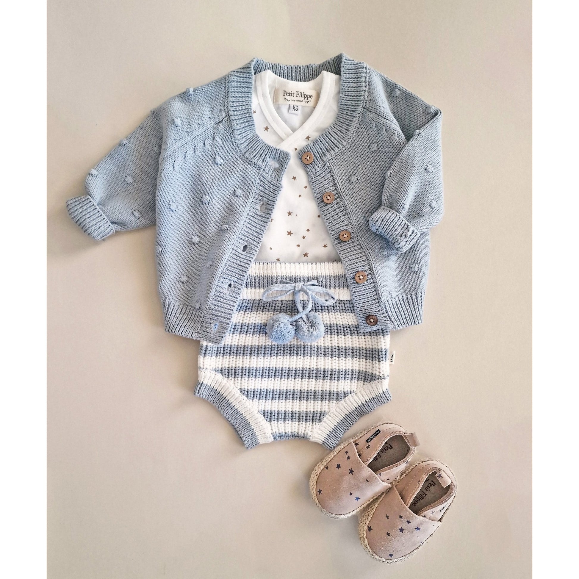Soft and comfy knitted baby cardigan with wooden buttons and knitted dots. Made of organic cotton. Perfect as a light layer on chilly days, for any season! This knitted cardigan is set to be a miniature classic.