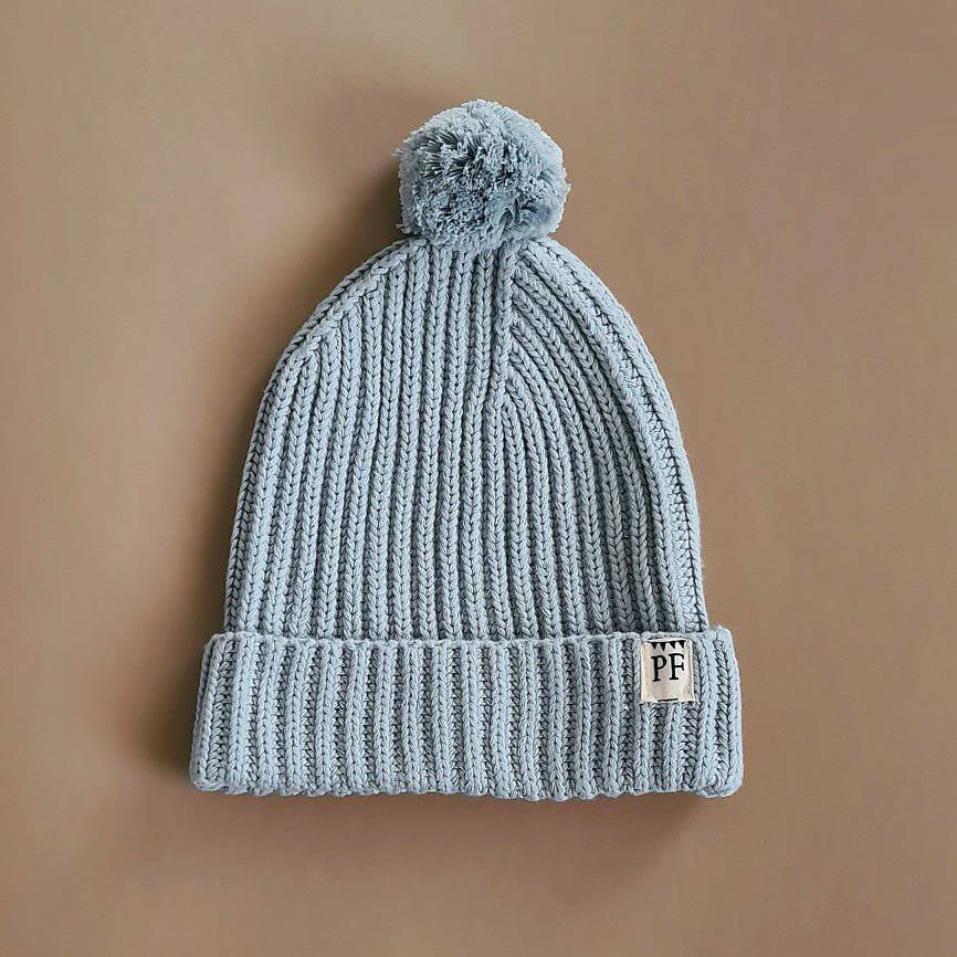 Knitted Beanie with Pom Pom - Cotton - Misty Blue