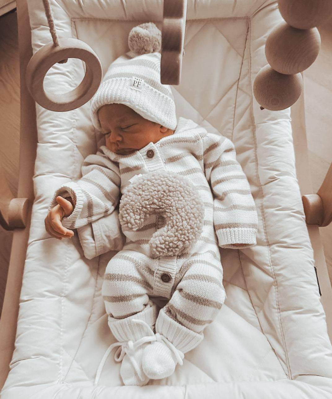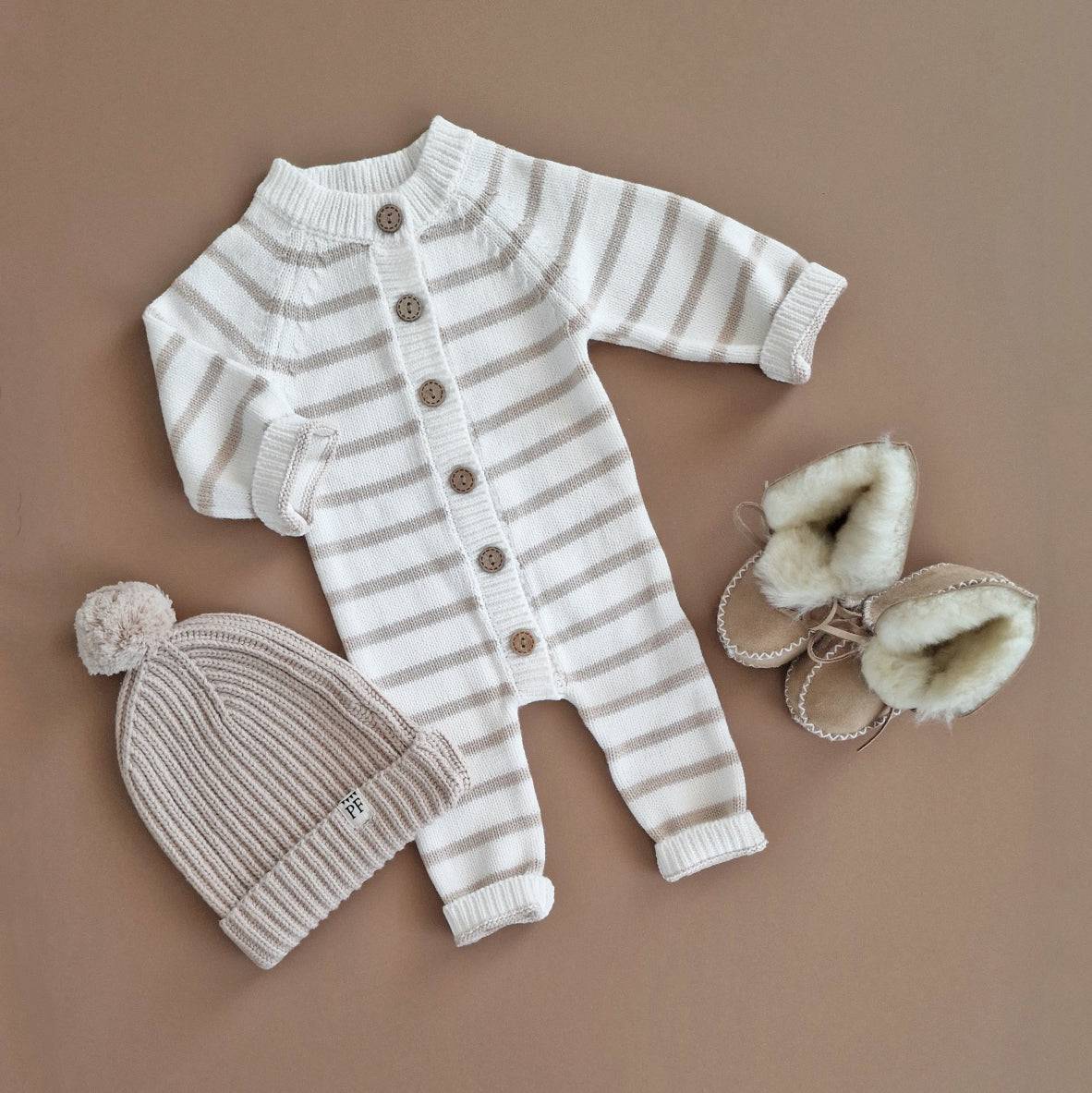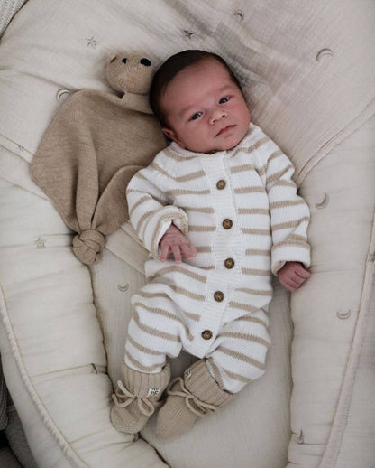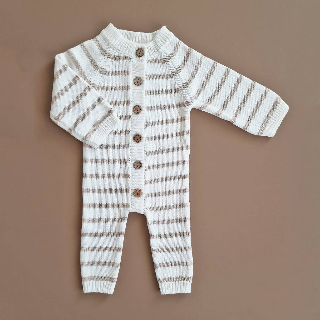 Soft and comfy knitted baby playsuit with wooden buttons. Made of organic cotton. For boys and girls.